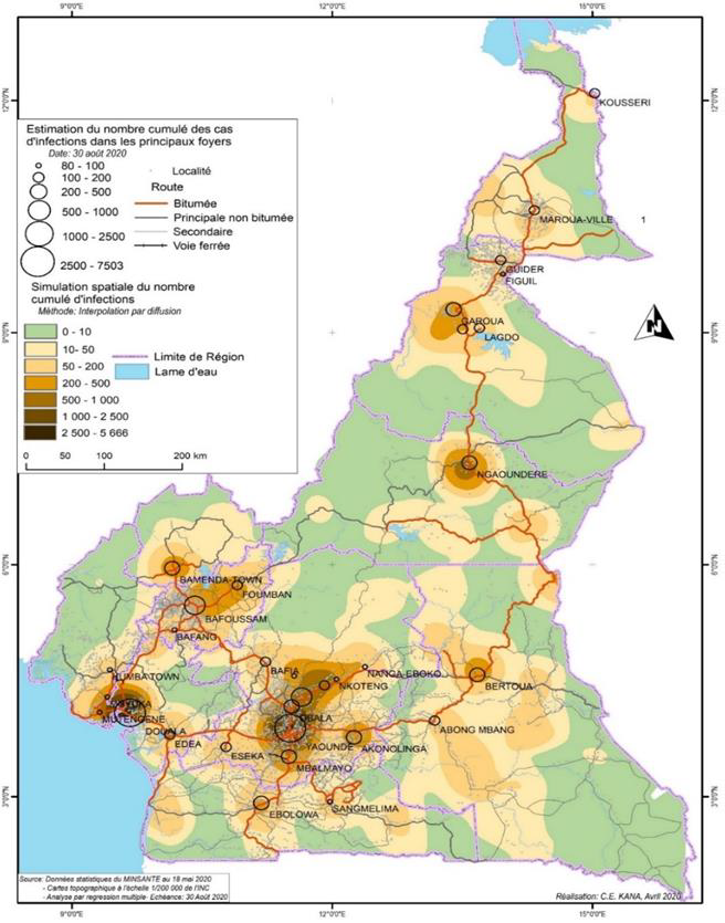 Source : Kana CE, Etouna J, Nguendo-Yongsi HB. Modélisation spatiale de la propagation de l’épidémie à COVID-19 au Cameroun. Revue Espace géographique et Société Marocaine. 2020; 40: 151-171.